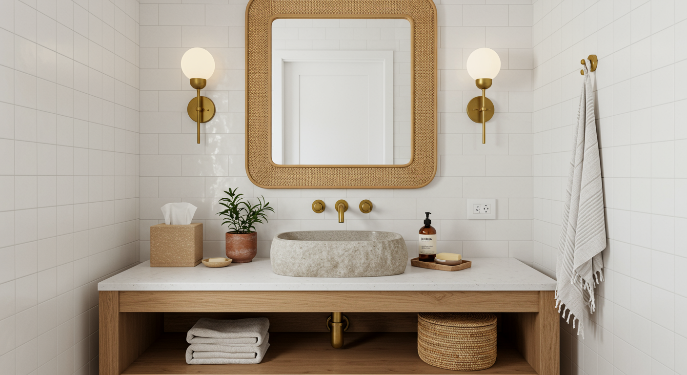 Warm wood is making a comeback, notes designer Lindye Galloway, based in Costa Mesa, California. “Wood can bring warmth, depth, and an intimate feel that creates a serene scene,” she says. Galloway particularly enjoys incorporating it into the ceiling and vanity pieces in the bathroom. “This can especially help with an all-white bathroom where you want to keep it light and bright but have that warm feeling,” she adds. On a smaller scale, consider DIY’ing a warm wood frame for an existing mirror that could use an upgrade, or swapping builder-grade metal drawer pulls with stylish wooden elements.