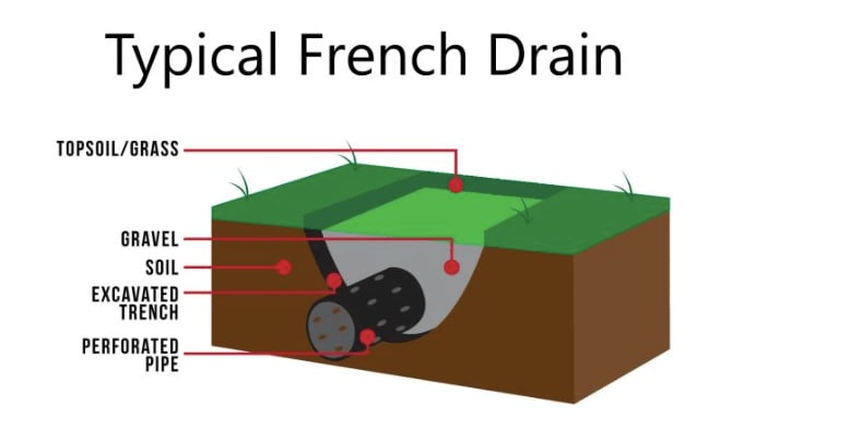 French drains disperse water over a large area through a buried pipe. The pipe must be surrounded by a material that allows water to drain through it, such as gravel. For homes situated on slopes, this drain is an ideal solution to divert surface water away from the house to prevent water damage. Remember to ask local authorities to mark the location of underground utilities before you dig.