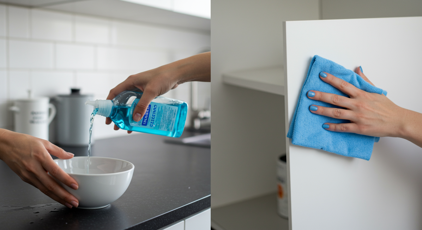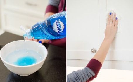 - Use dish soap and water to clean any grease or grime from your cabinets.