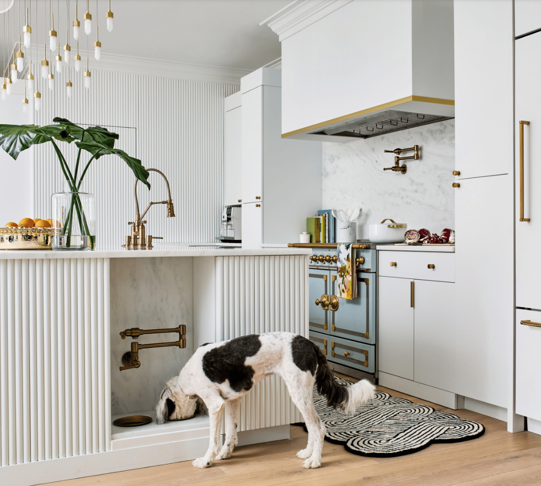 Built-in feeding stations—integrated at the end of an island or along a cabinet run—can create a clean, designated space for food and water, with the option to include a convenient pot filler. Nearby, a pullout or tilt-out cabinet can neatly store pet food and supplies.